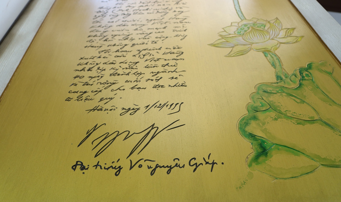 Trên mặt bìa, chân dung cố Đại tướng Võ Nguyên Giáp kích thước 50x70cm được chạm nổi 3D trên gỗ sau đó dát vàng thật 24k.