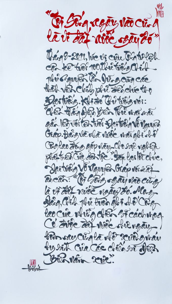 Nghệ nhân quốc gia, Kỷ lục gia Võ Dương cho biết: Sau khi được sự đồng ý của gia đình Cố Đại tướng Võ Nguyên Giáp và mua bản quyền từ Nhà xuất bản Trẻ TP.HCM cho nội dung cuốn sách “Võ Nguyên Giáp – Những năm tháng cuộc đời”, anh đã dành gần 2 năm miệt mài thực hiện bằng nghệ thuật thư pháp chữ Việt (từ tháng 2/2017 – 9/2018) với vô vàn khó khăn.