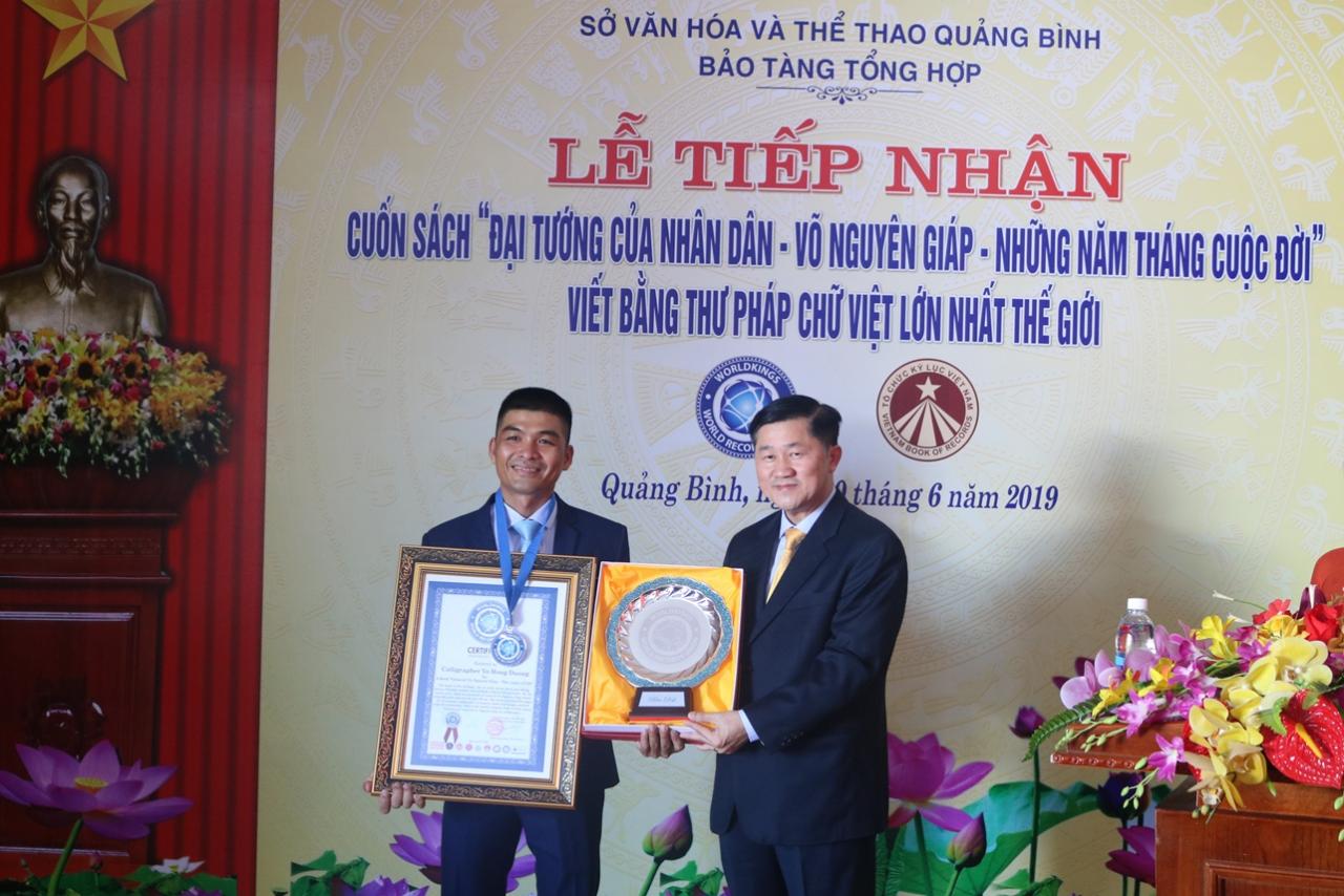 Sáng ngày 20/6/2019, diễn ra sự kiện Lễ trao tặng sách thư pháp “Đại tướng của nhân dân Võ Nguyên Giáp – Những năm tháng cuộc đời” của Kỷ lục gia, Nghệ nhân quốc gia Võ Hồng Dương cho Bảo tàng Tỉnh Quảng Bình nhân dịp Kỷ niệm 30 năm ngày tái lập tỉnh Quảng Bình (01/7/1989 – 01/7/2019). Đây cũng là dịp cuốn sách được Liên Minh Kỷ lục Thế giới – WORLDKINGS xác nhận Kỷ lục Thế giới.
