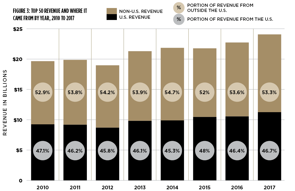 The total research revenue for the top 50 companies in 2017 was $24.08 billion. More than 46% of that revenue, $11.24 billion, was generated in the U.S. while more than 53%, $12.83 billion, was generated outside the country.