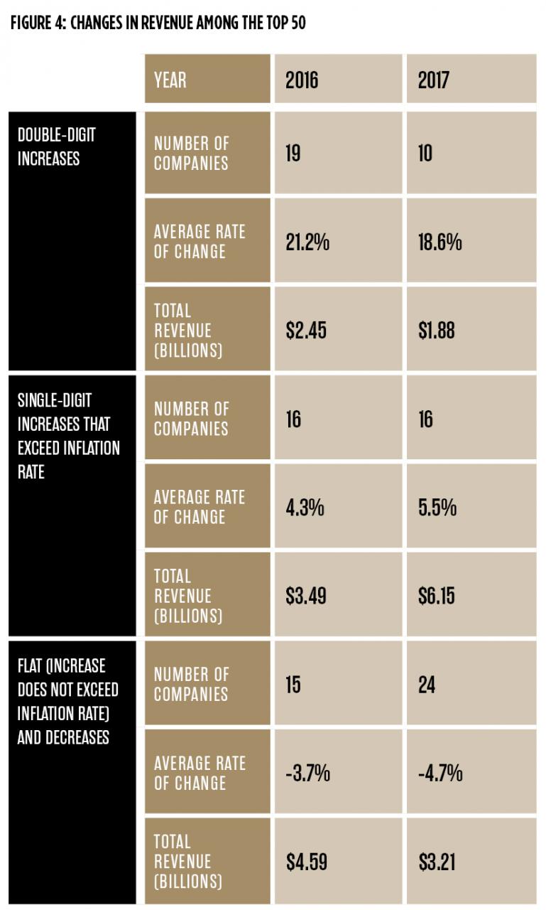 Nearly half of the top 50 companies reported that revenue was flat or decreased in 2017, averaging a 4.7% drop. One-third of the top 50 companies reported single-digit increases in year-over-year revenue, averaging 5.5% growth. The number of companies with single-digit increases has remained stable over the past three years. The greatest swing, particularly from 2016 to 2017, has been the decline of double-digit increases in year-over-year revenue and the corresponding rise in companies whose year-over-year revenue decreased in 2017.